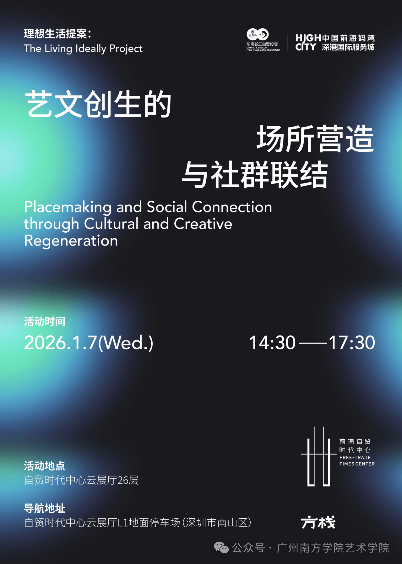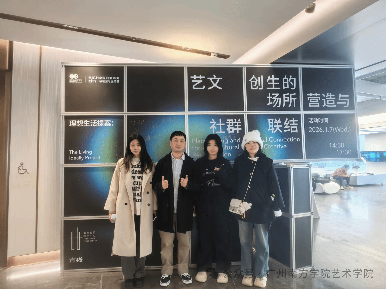 2026年1月7日下午,我院教师覃剑伦带领三位学生陈睿馨、陈如意、陈芷晴,受邀前往深圳自贸时代中心参与“理想生活提案:艺文创生的场所营造与社群联结”行业论坛,聆听多位重量级嘉宾的分享。当晚,我院师生还到访了深圳安托山公共文化中心,开启了一场融合实践探索与文化浸润的剧场学习之旅。