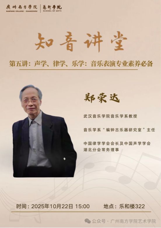为进一步提升实践教学质量、开拓师生专业视野,20251022日,广州南方学院艺术学院成功举办 知音讲堂系列活动第五讲。本次讲座以美育素养提升与人文情怀涵养为核心目标,围绕《声乐、律学、乐学:音乐表演专业素养必备》主题展开深度分享,特别邀请武汉音乐学院音乐学系教授、音乐学系 编钟古乐器研究室主任、中国律学学会会长及中国声乐学学会湖北分会常务理事郑荣达教授莅临主讲,为艺术学院师生搭建了一场兼具专业深度与人文温度的学术交流平台。