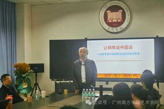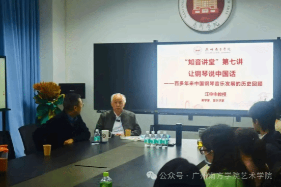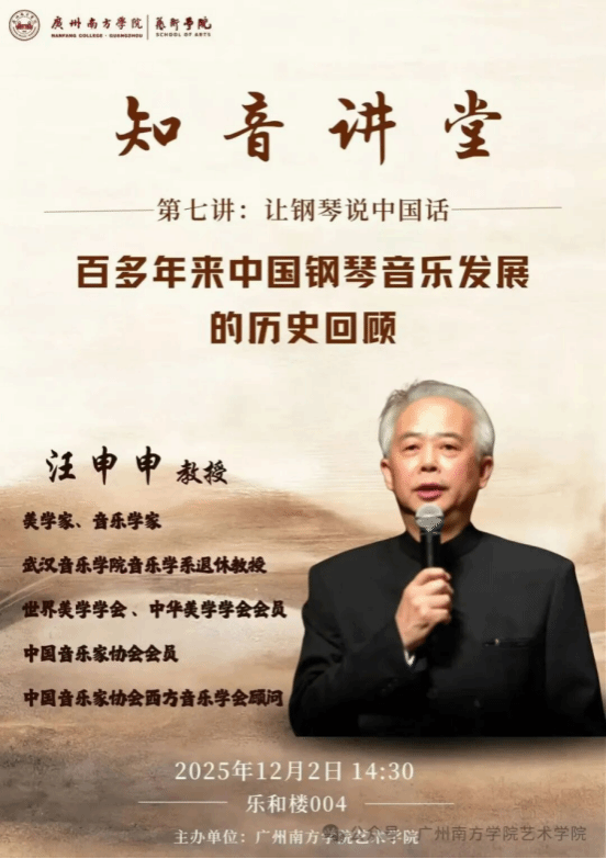 为深耕音乐艺术专业建设、拓宽师生学术视野,2025年12月2日,广州南方学院艺术学院“知音讲堂”第七讲在乐和楼004顺利开讲。本次讲堂以“让钢琴说中国话——百多年来中国钢琴音乐发展的历史回顾”为主题,特邀美学家、音乐学家汪申申教授莅临主讲,为师生系统梳理中国钢琴音乐从“西乐引入”到“民族化表达”的百年演进脉络,搭建了兼具专业深度与文化温度的高质量学术交流平台。