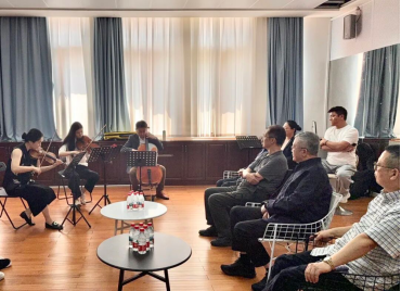 当日下午,学院相关负责人向于海教授介绍了学院优秀教师代表,姚丹、骆雨晨、刘蔚鹏三位教师现场演绎弦乐三重奏,充分展现了学院教师扎实的专业功底与良好的艺术风貌。